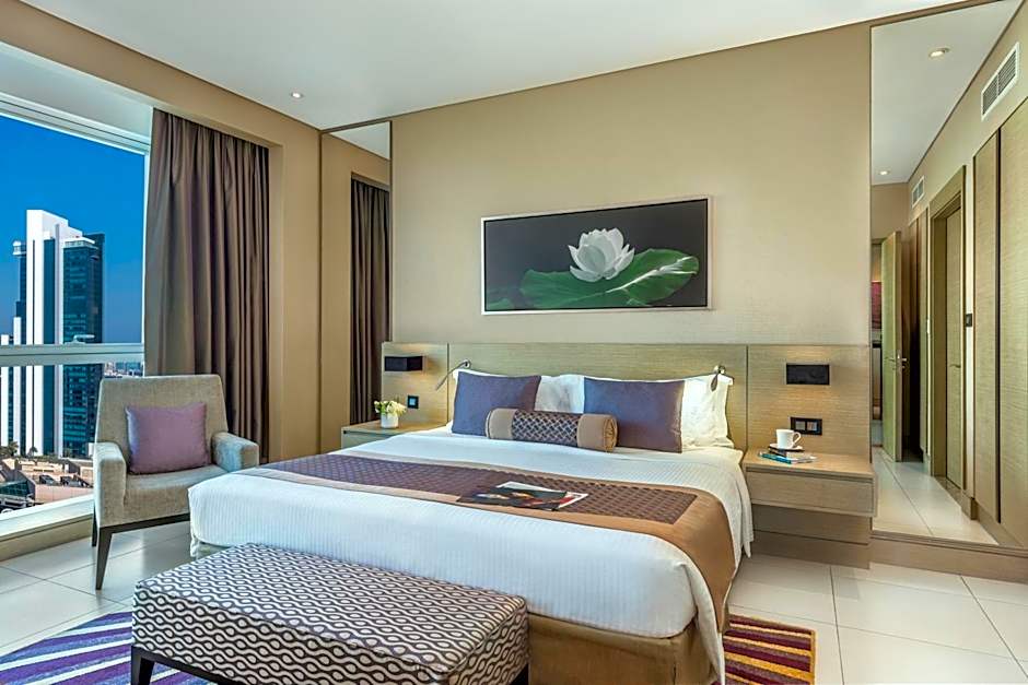 This One-Bedroom Apartment features a spacious living room with dedicated dining area, a kitchenette and a comfortable bedroom with a king size bed. It has built-in wardrobes, full-size bathroom fitted with a tub, a separate shower and bath amenities. Added amenities include an interactive LED TV, IDD telephones, complimentary WiFi, an in-room electronic locker, coffee and tea making facilities and a hair dryer.